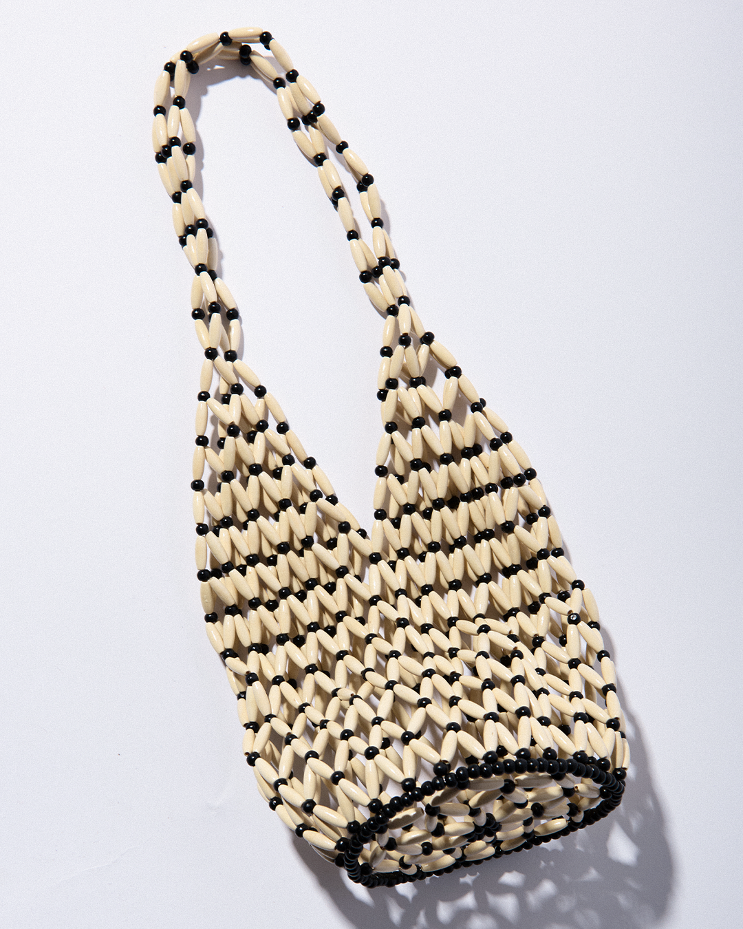 A supple bucket bag crafted entirely from smooth wooden beads, hand-strung to form a soft, flexible silhouette that drapes effortlessly in the hand. Its sculptural shape and fluid texture offer a unique balance of structure and movement.